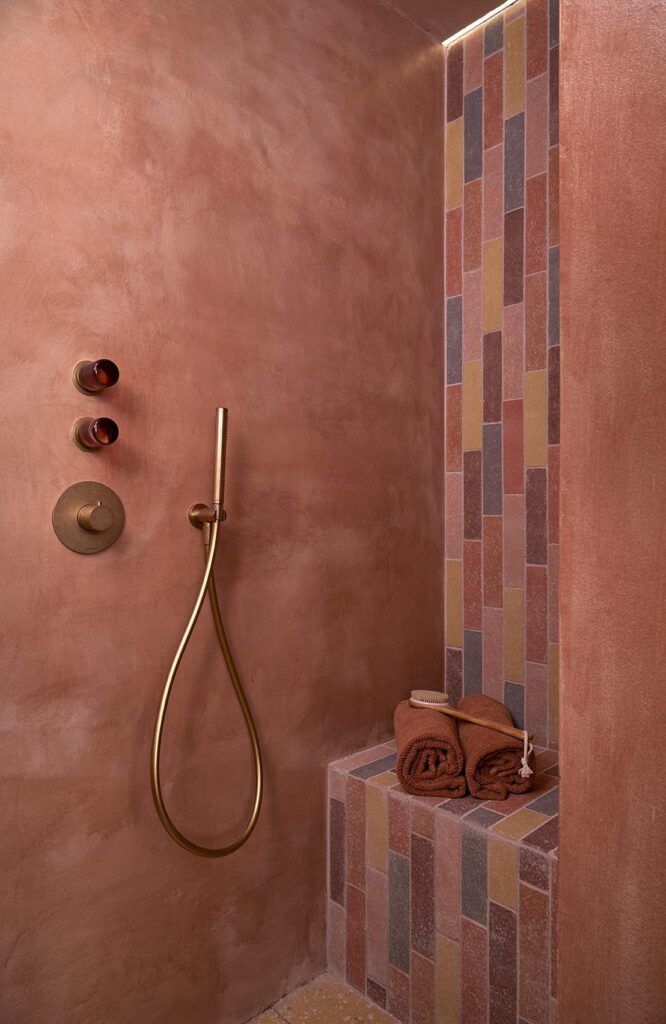 Les couleurs comme le bourgogne et le beige dominent, la peinture à la chaux et les carreaux à motifs ajoutent du caractère, et la douche en alcôve transforme la routine en expérience.