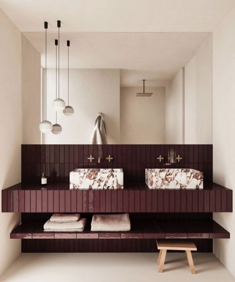 Le Bourgogne s’impose comme la couleur phare des salles de bain haut de gamme en 2026. C’est une teinte profonde, sensuelle et enveloppante qui apporte instantanément un effet moody et théâtral à la pièce. Utilisée en total look, elle transforme une salle de bain en véritable cocon sophistiqué, presque comme une suite d’hôtel au cœur de Milan. Mais pour ceux qui préfèrent un équilibre plus doux, le Bourgogne se marie aussi magnifiquement avec des tons sable, du beige chaud ou encore des textures de pierre naturelle.